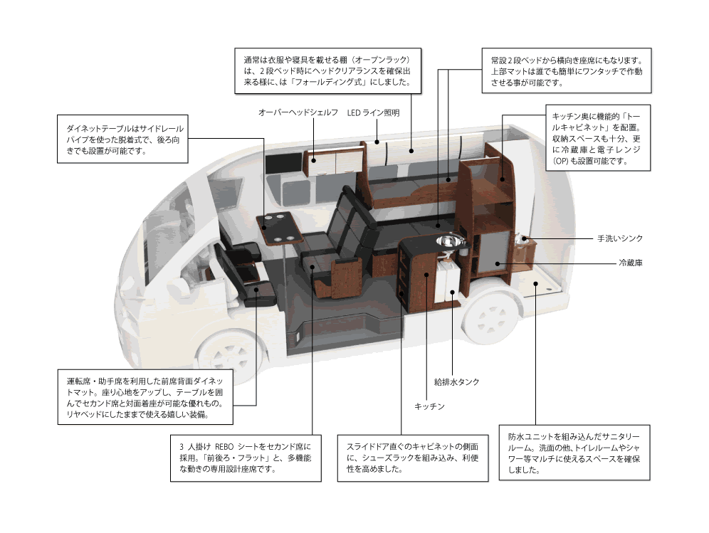 高機能とデザイン性を兼ね備えたレクビィのロングセラー。移動時と就寝時の要素を凝縮した全方位型バンコンバージョン。