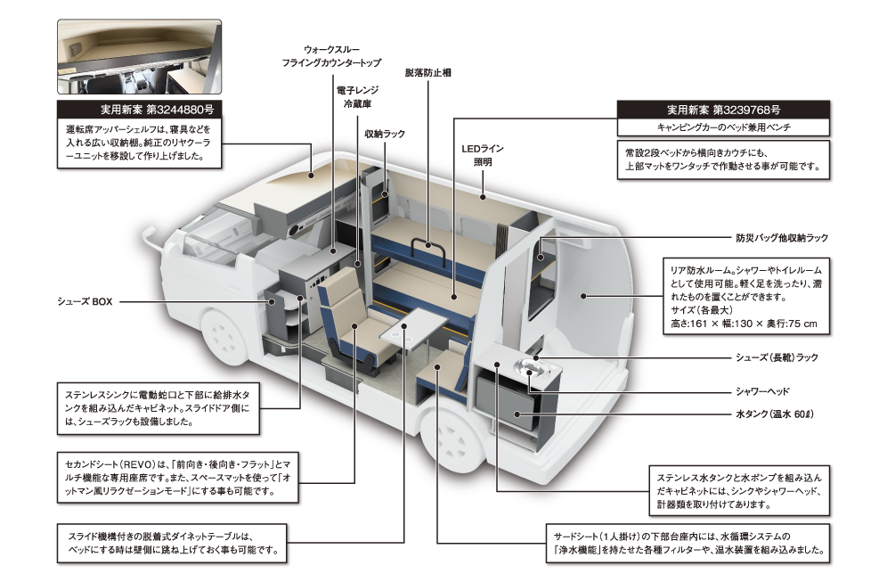 エマージェンシーバック、工具、ウォータレストイレも搭載しました。
