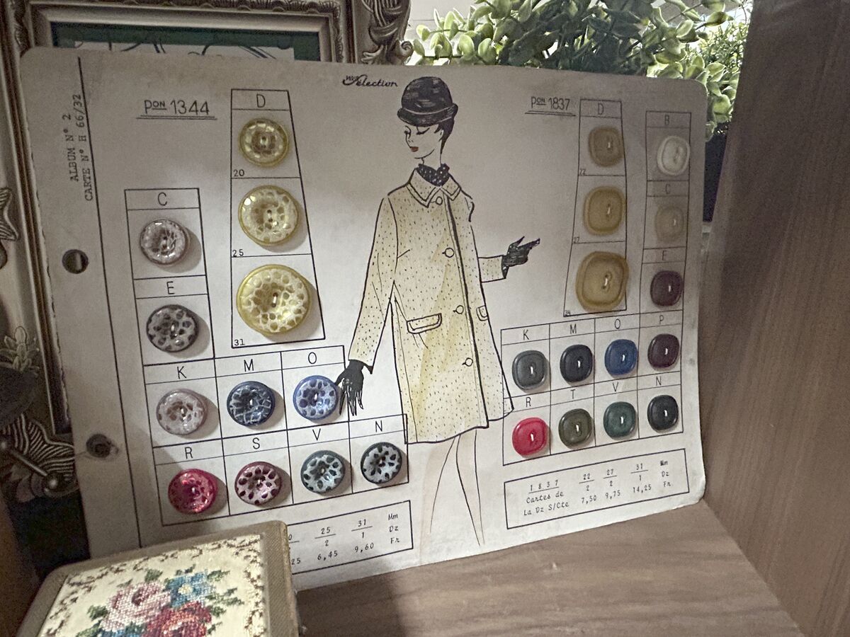 趣のある重厚な飾り棚キャビネットに、昔のヨーロッパで婦人服モードとボタンの関連を示したビンテージカタログの1ページが飾ってあった。