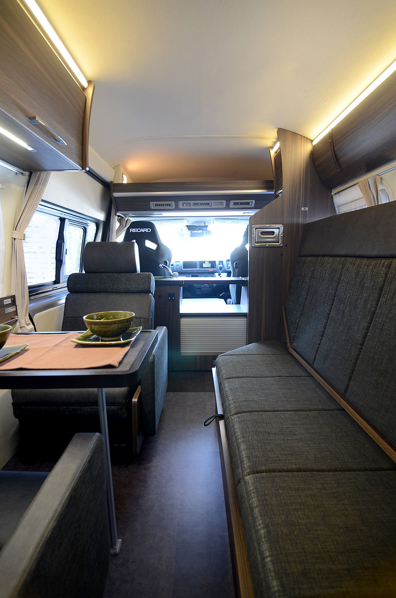 キッチンは運転席後部へ。機能的且つグラマラスなキャビネットには、フロント席へのウォークスルーも。