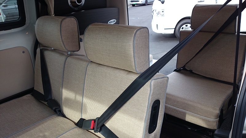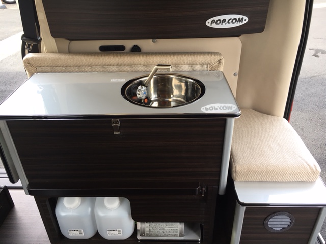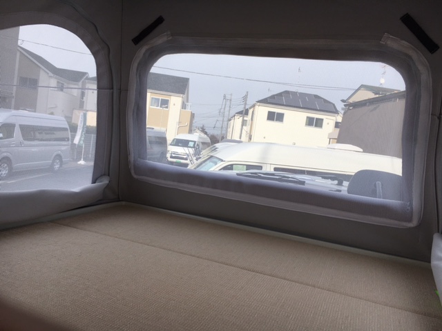 ・主要装備:オリジナルポップアップルーフ / 断熱材封入+FRPパネル+室内フルトリム(難燃性ニット仕上げ) / 2名掛けセカンドシート(左右3点式シートベルト) / 1名掛けサードシート(3点式シートベルト) / ダウンギャレーシステム(清水タンク 5g×2) / 床下FRP製12g排水タンク / サブバッテリー (105Ah-AGMタイプ)+走行充電システム / AC100V外部入力コンセント&専用ケーブル / 室内LED照明 (全5点) / サイドウォールラック / プライバシーカーテン / 脱着式ダイニングテーブル