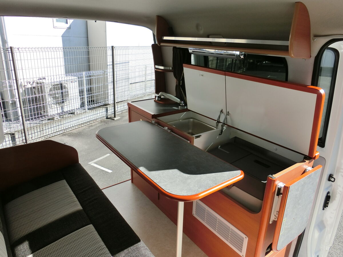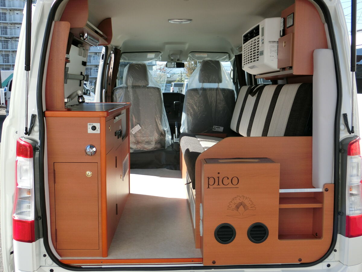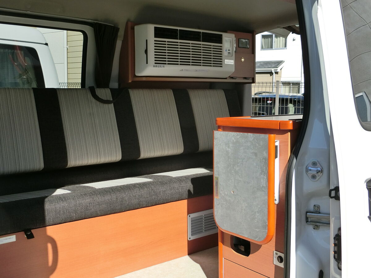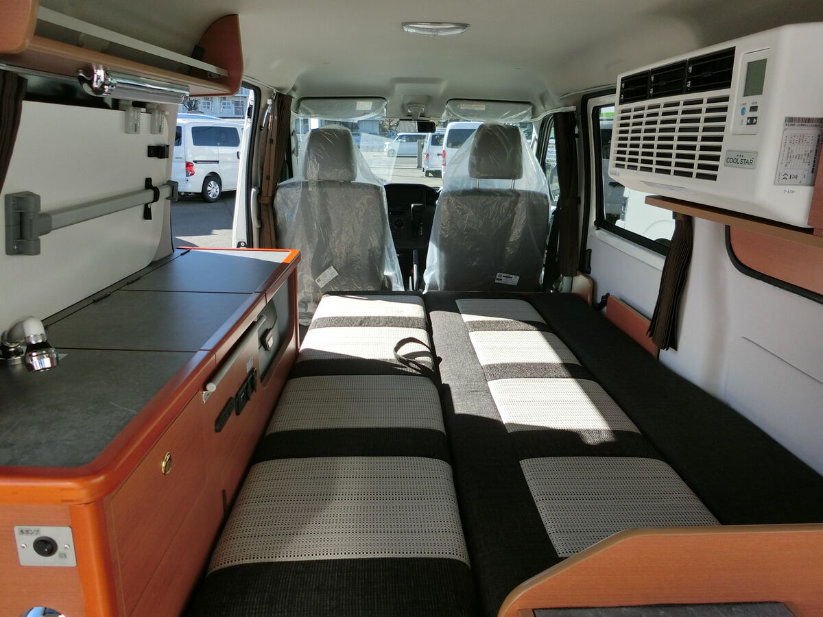 ・主要装備:室内フルトリム(断熱材入り) / 防汚抗菌クッションフロア / 右側リヤサイドウォールラック / ワンタッチスイングシート&ベッド(オリジナル製品) / シート下収納庫(2ヶ所アクセス) / 横向きシート専用2点式シートベルト×2名分 / 左側ストレートギャレー(カウンターオープンタイプ) / 清・排水各10gポリタンク / シャワーフォーセット(引き出しタイプ) / ギャレー前後 調味料ラック / 折畳みカセットコンロ台 / カセットコンロ専用収納庫 / オープントップ型14L冷凍冷蔵庫 / 遮光性プライバシーカーテン(全面) / リチウムイオンサブバッテリー(200Ah)+走行充電システム / AC100V外部入力コンセント&車内出力2口コンセント / DC12Vシガーソケットタイプ1口コンセント / 室内照明(LED主照明×1・LEDスポット×2・LEDギャレー照明) / リヤシート後部ラック&ティッシュBOX / ダイニングテーブル