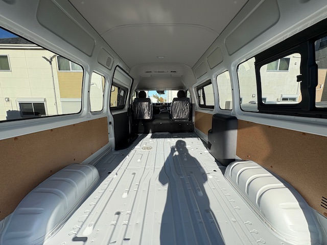 ・主要装備:室内フルトリム(断熱材入り) / 防汚抗菌クッションフロア / 右側リヤサイドウォールラック / ワンタッチスイングシート&ベッド(オリジナル製品) / シート下収納庫(2ヶ所アクセス) / 横向きシート専用2点式シートベルト×2名分 / 左側ストレートギャレー(カウンターオープンタイプ) / 清・排水各10gポリタンク / シャワーフォーセット(引き出しタイプ) / ギャレー前後 調味料ラック / 折畳みカセットコンロ台 / カセットコンロ専用収納庫 / オープントップ型14L冷凍冷蔵庫 / 遮光性プライバシーカーテン(全面) / リチウムイオンサブバッテリー(200Ah)+走行充電システム / AC100V外部入力コンセント&車内出力2口コンセント / DC12Vシガーソケットタイプ1口コンセント / 室内照明(LED主照明×1・LEDスポット×2・LEDギャレー照明) / リヤシート後部ラック&ティッシュBOX / ダイニングテーブル