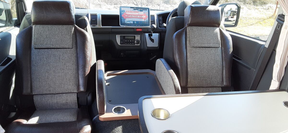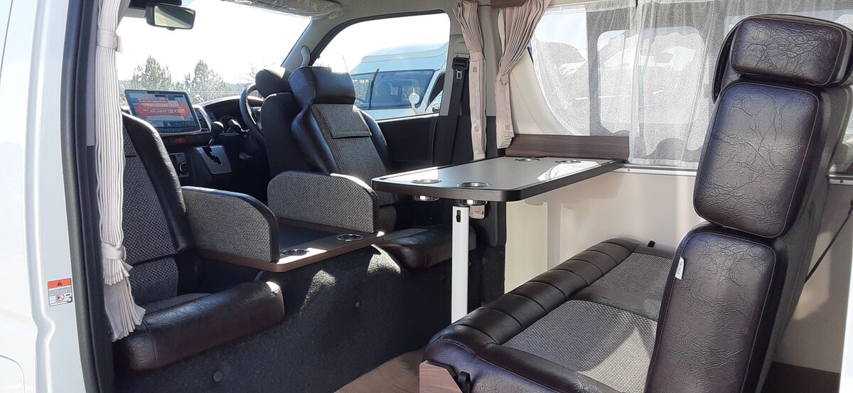 ・フロントダイネットマットにより、スライドとリクライニングするだけで前席とセカンドシートでテーブルを囲むことが出来ます。