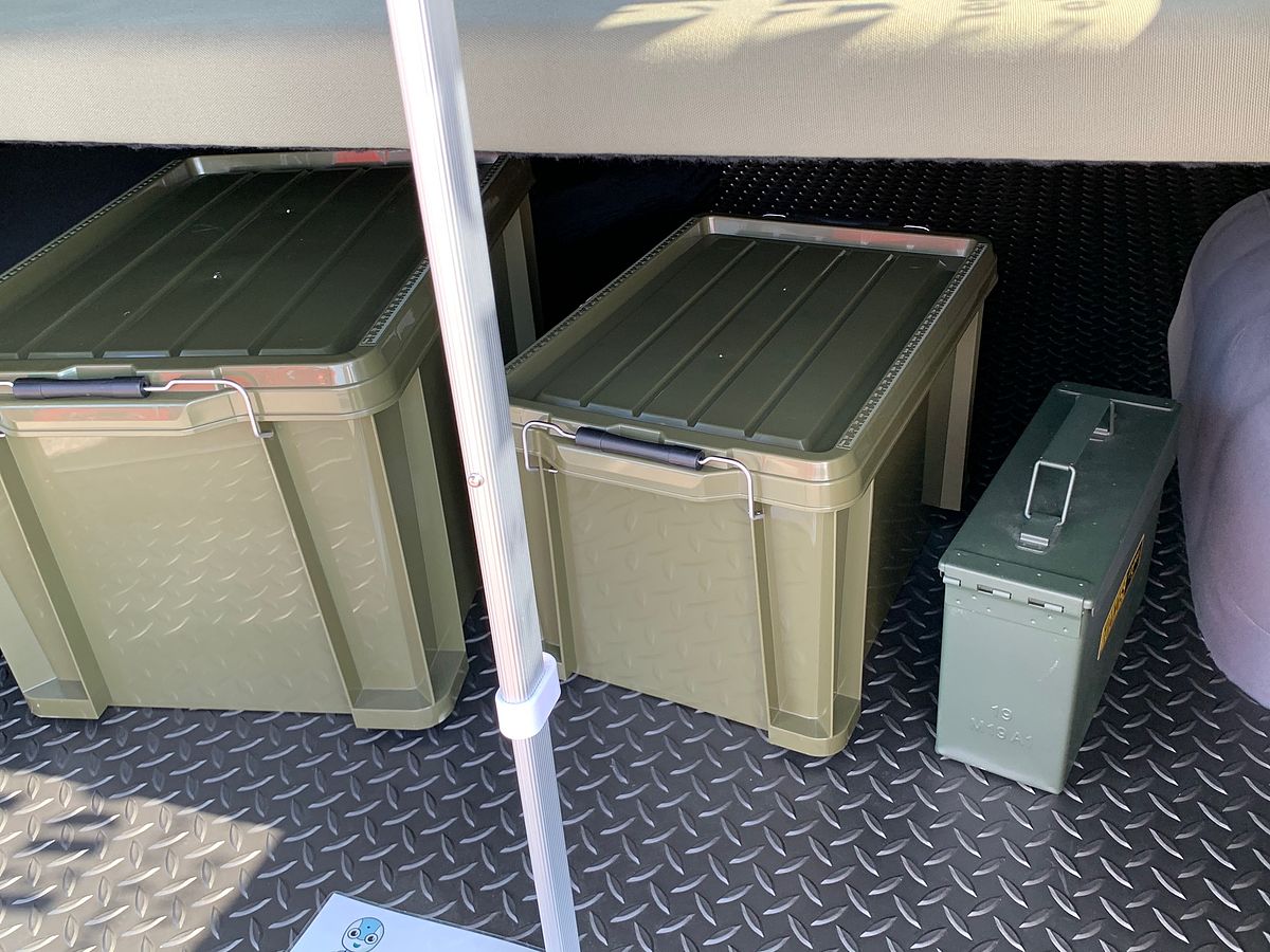 リヤバゲッジスペースには、アウトドア感を出す「コンテナボックス」をいくつか置いてみたよ〜。