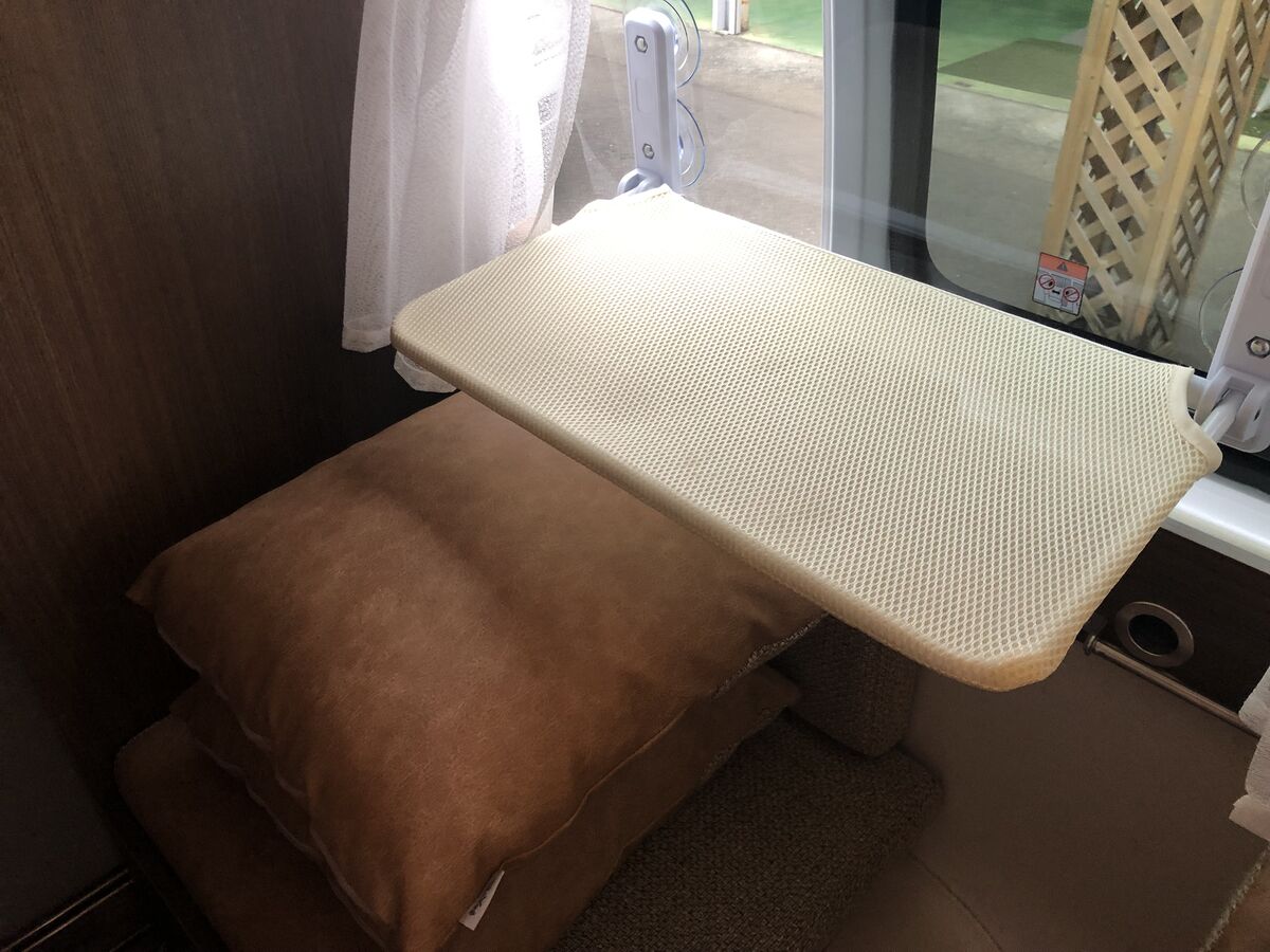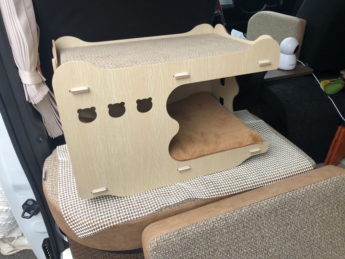車体左側のサードシートの窓には猫ちゃん達が外を見るための台が設置してありました!